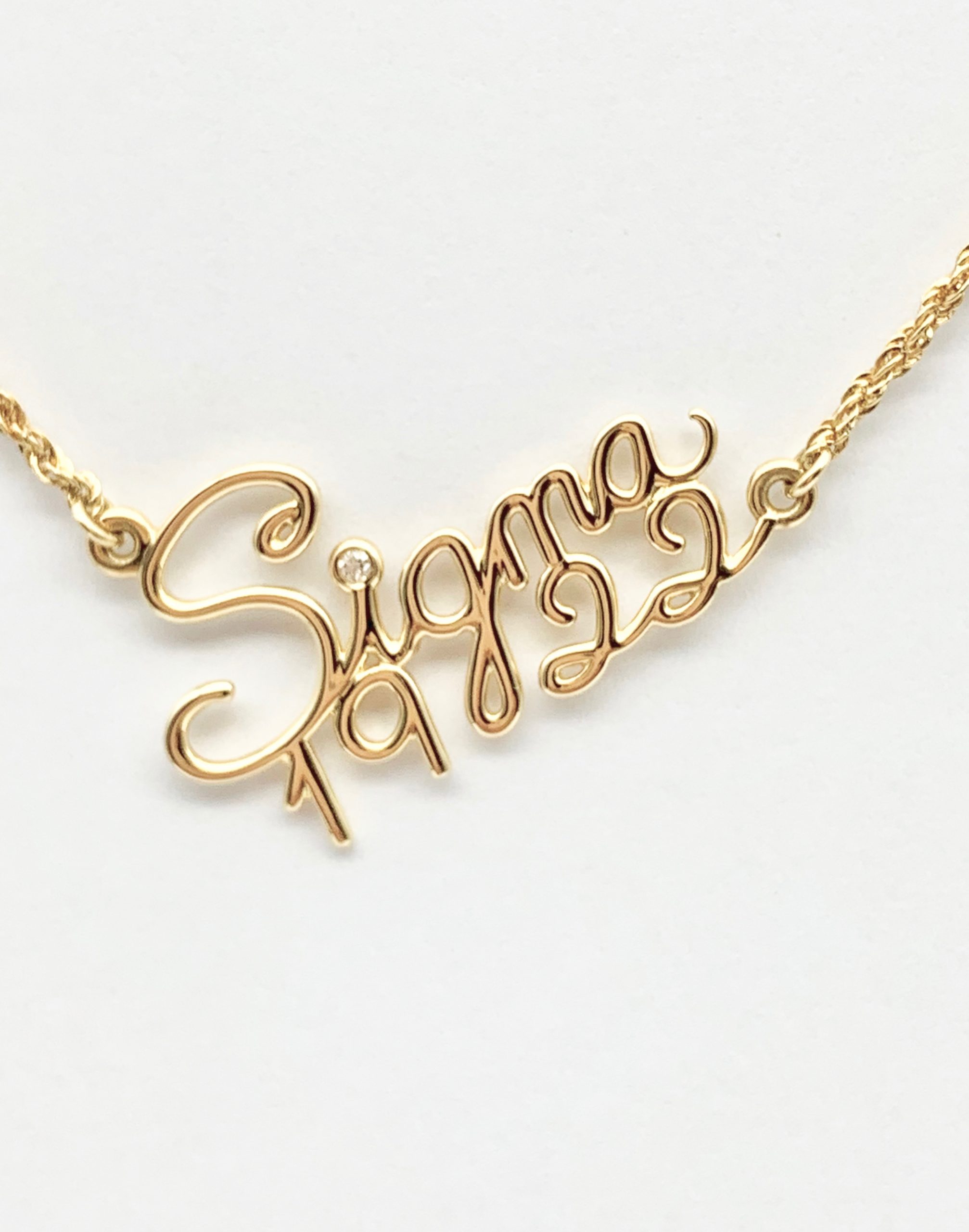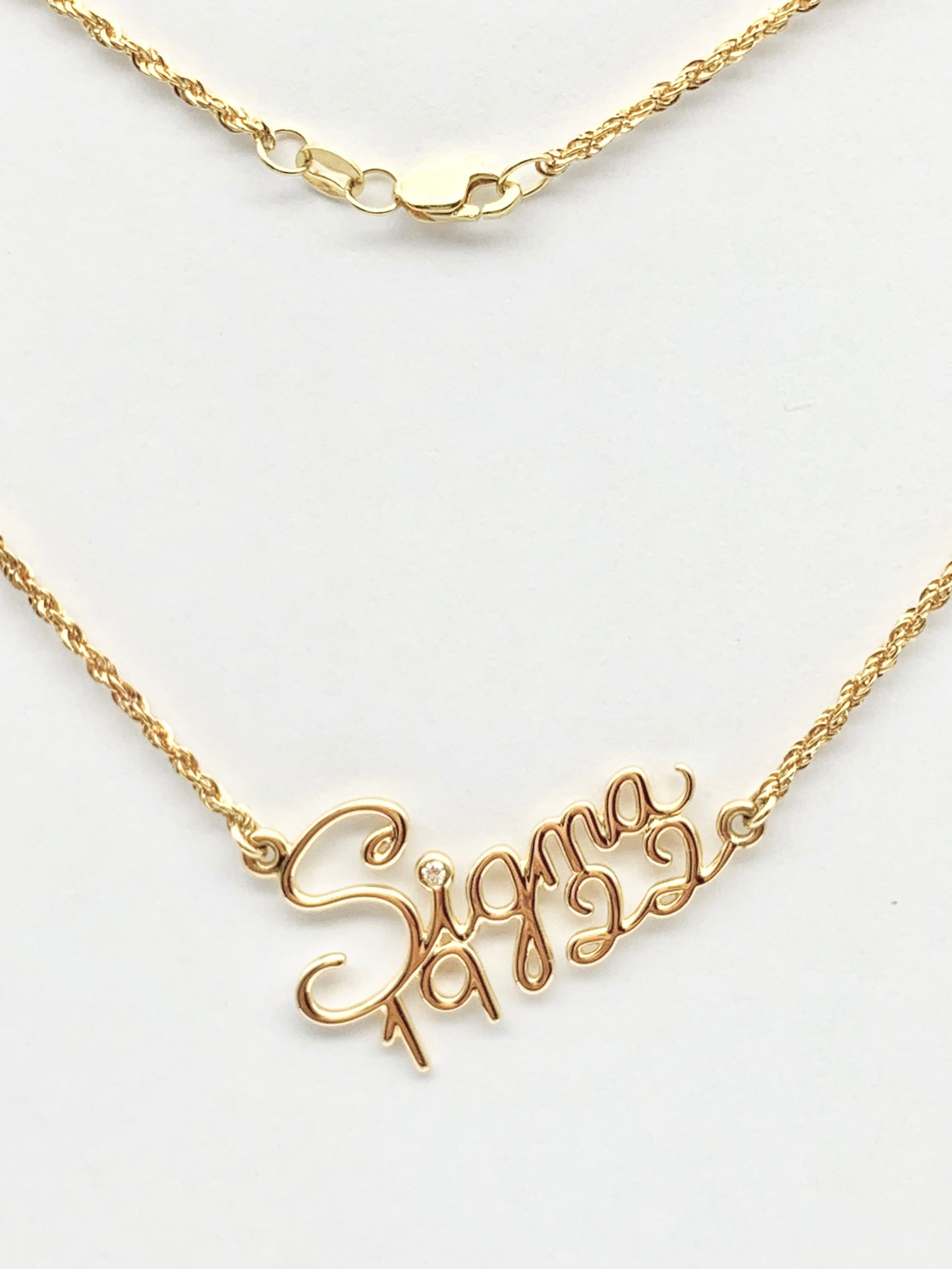 Women of Sigma, we know exactly what you like. This one is presented to Sigma With Love! Introducing “The Sigma 1922 Lean Necklace.” It gleams in 14 kt. gold while leaning on its extra golden, 16-inch rope chain. This memorable and One-of-A-Kind piece will turn all the RHOyal Heads in your direction! It is finished with a lobster claw closure and a 1.5 MM lab-grown diamond to dot the “i” for an added flash of brilliance. Prepare to Elevate Your Sigma Style and get your Lean Fix Too!